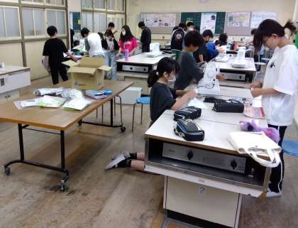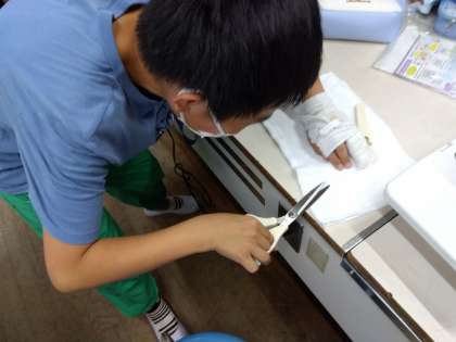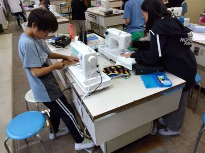 6年生の家庭科の様子です。エプロンを作成しています。エプロンができあっがった人はぞうきんの作成をしています。集中して作品作りに取り組んでいました。
