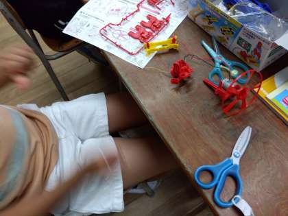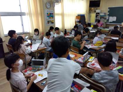 4年生の理科です。回路の学習で教材を組み立てて、実際に回路に電流を流したときにどのようになるのかを確認します。わからないときは相談をして組み立てています。