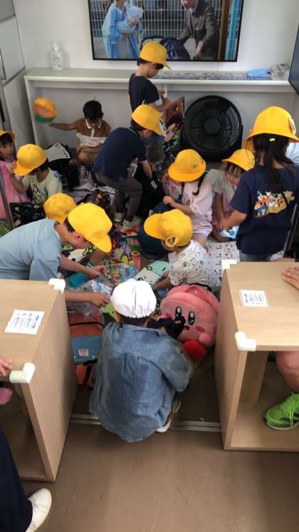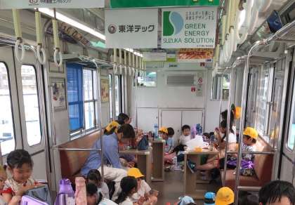お弁当を食べています。昼食場所はモビリティタウンの電車の中です。古い電車が休憩室になっていて涼しくお弁当を食べることができました。