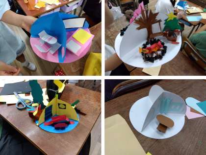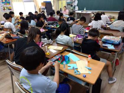 4年生の図工です。色画用紙で立体造形に取り組んでいます。それぞれ工夫してかわいい作品ができてきています。