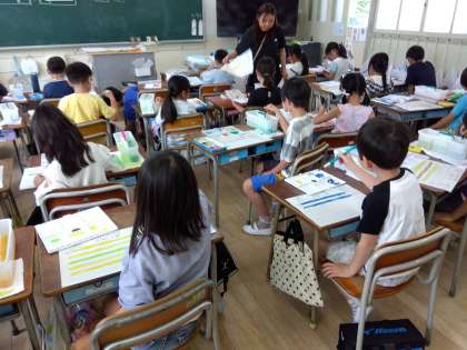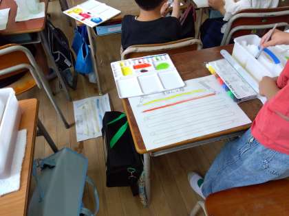 図工では筆の使い方を学習しています。ワークシートの指示に従って、上手に筆を使っていました。