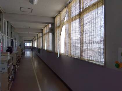 暑さ対策のため、西校舎の廊下にすだれを設置しました。西日が当たり、特に午後からは暑くなっていましたが、涼しく過ごせるようになればと考えています。