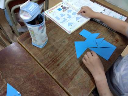 3年生の算数「かたちであそぼう」でタングラムも問題に取り組んでいる様子です。一つでも多くの図形ができるよう、真剣に取り組んでいました。