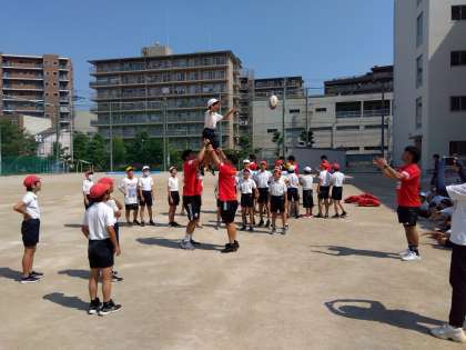 6年生の授業で、レッドハリケーンズの選手の皆さんがラグビーの体験授業をしてくださいました。ラグビーボールを使って、普段はできない体験をすることができました。次は7月4日(金)に5年生が体験する予定です。