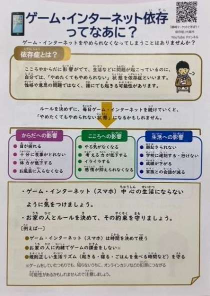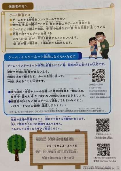 大阪市より「ゲーム・インターネット依存ってなあに?」という啓発チラシが届きました。4〜6年生へはお手紙として配布します。1〜3年についても夏休みに入る前に、ご家庭でゲーム・スマートフォンの使い方や使う時間などについて、お子さまと話し合っていただきたいと思います。