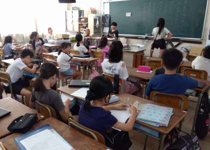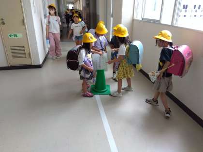 児童の皆さんが安全に過ごせるよう、標語を考えたり、掲示をしたりしています。写真は5年生が標語を考えているところと、1年生の廊下の様子です。