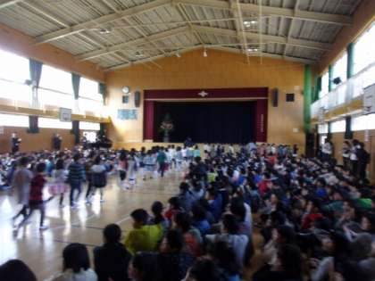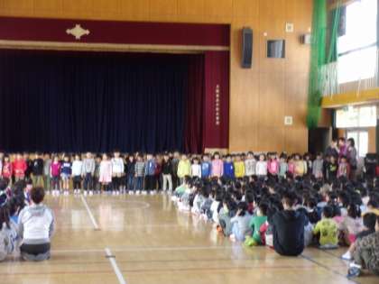 写真は1年生と2〜6年生との対面式の様子です。