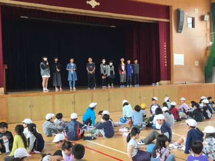 小松小学校では、ペア学年(1.6年 2.4年 3.5年)を組んで、集会を行っています。5月10日(木)は、2.4年集会でした。朝の会の時間に講堂で楽しみました。今年度1回目だったので、それぞれのグループが集会委員の皆さんの企画で、自己紹介などのゲームを行いました。