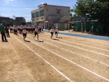 6月1日(金)、体力テストのうち「50m走」と「ソフトボール投げ」の2種目を大阪成蹊大学のグランドをお借りして、一日で全学年実施しました。本校にかかわってくれている学生ボランティアのみなさんも、走路をかいたりソフトボール投げの場所をかいたりすることをてつだってくれました。