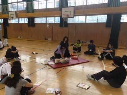 6月6日(木)の放課後、教職員対象に「普通救命法講習会」が実施されました。傷病者への心肺蘇生法、AED(自動除細動器)の使い方をならいました。命を救うためには、救急車を末までの間に、いかに早く心肺蘇生をほどこすことが重要かということを再認識しました。