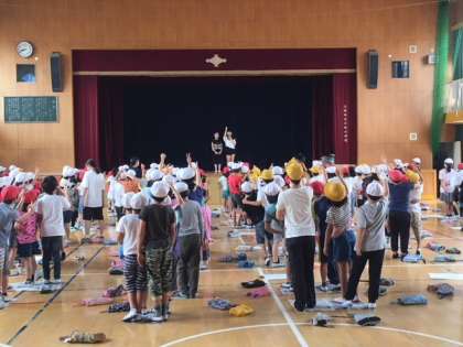 6月21日(木)の朝の時間に講堂で3年と5年のなかよし集会をしました。集会のゲームは他の学年と同じで、じゃんけんでまけると、新聞紙を半分に折っていき、全員が乗っていられるかということです。みんな仲良く楽しみました。