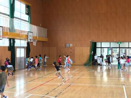 今日の15分休みは、体育館で一年生が楽しそうに大縄やドッチビー、バスケットボールをしていました。