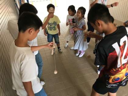 1年生は昔遊びの一環でみんなにけん玉が配られているので、みんなそれに夢中です。