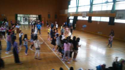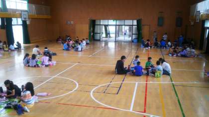 今日の昼は、お弁当を講堂で食べました。その後、みんなでドッチボールをして体を動かしました。