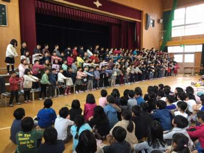 詩の朗読にはじまり,一年間を振り替えるように群読をした後,歌を歌いました。最後には一年間で学習した楽器を使った合奏も行いました。
