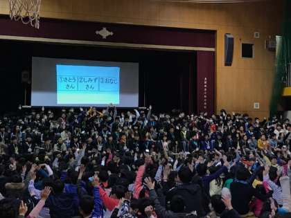 まずはじめは児童会の人によるクイズがありました。声当てクイズでは普段とは違う先生の声もあり、みんな驚いていました。