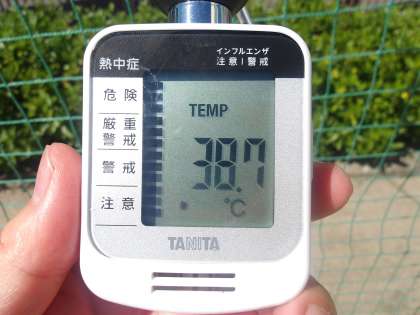暑い日が続いています。9月に入りましたが、外遊びができていません。お昼の運動場の計器は38.7度を示しています。