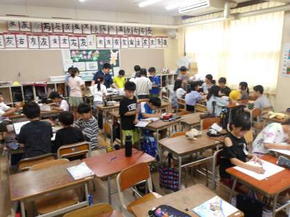 4年生のこまつハッピーフェスティバルの準備の様子です。班ごとに分かれて相談したり、役割分担をしたりしながら作業を進めています。