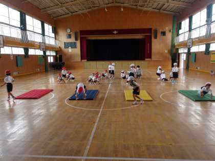 1年生の体育ではマット運動をしています。