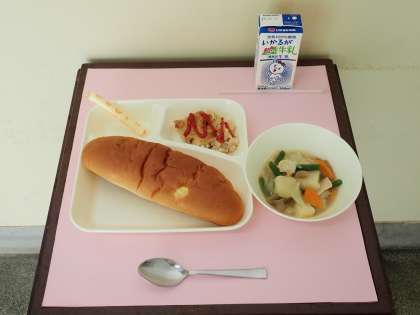 これまでは「とうふハンバーグ」として出ていましたが中学生も同じものを食べることができるようにと、とうふハンバーグと同じ材料でミニバットに入れて焼き物機で焼くことで調理時間を短縮した「とうふローフ」を栄養教諭が開発しました。