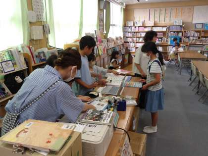 お昼休みの図書館の様子です。雨はやみましたがグラウンドの状態が悪いため外遊びは中止です。たくさんの児童が読書を楽しみました。