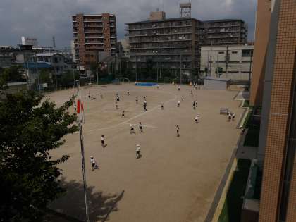 体育では運動場で追いかけっこをしました。赤帽のひとが白帽のひとを追いかけています。