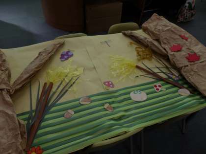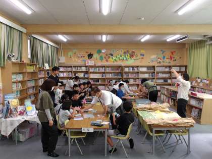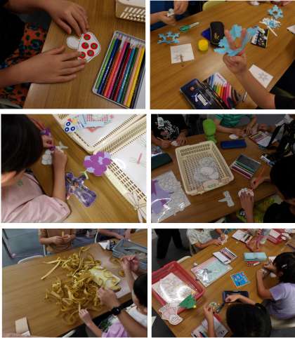 なかよしタイムの様子です。図書室で秋と冬の掲示物の作成をしました。自分の作りたいものに色をぬったり、シールを貼ったり、はさみで形を整えたりしました。みんなで楽しい時間を過ごすことができました。