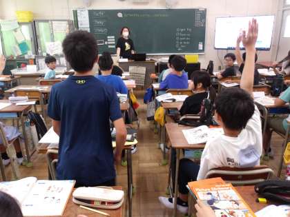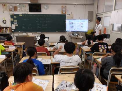 5年生の英語では"can"の用法を学習しています。"can"を使った文でクイズを作成し、出し合いました。