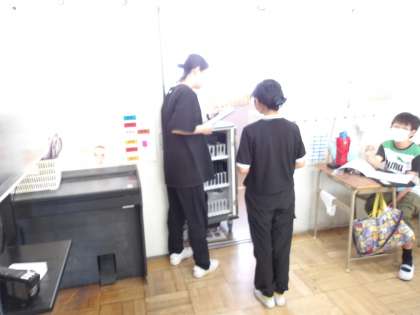 本日から学習者用端末が更新される学年は順次運用を始めています。写真は6年生の様子です。端末番号を確認しながら一人ずつ手渡しました。この後、それぞれ貸与された端末にログインし運用していきます。