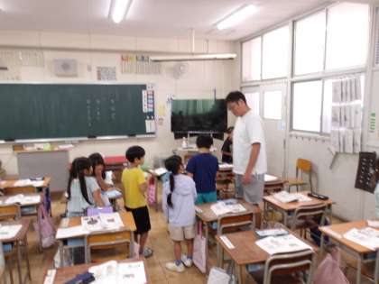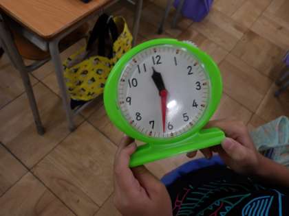 1年生の算数では時計の読み方を学習しています。時計の教材を使ってみんなで問題を出し合って確認しました。