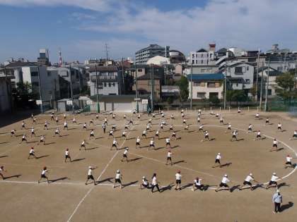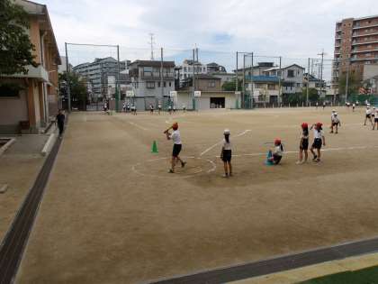 3年生の体育はティーボールのゲームをしました。5年生の体育は運動会の練習です。