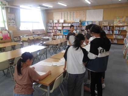 15分休憩の様子です。図書室では図書委員が読み聞かせの取組のための打合せをしていました。児童のみなさんには様々な機会を利用して本に親しんでほしいと思います。金曜日の図書室開館の日も積極的に利用しましょう。