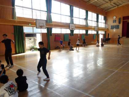 3年生が体育館でダンスに取り組んでいる様子です。動画を見てグループごとに取り組み、発表しました。