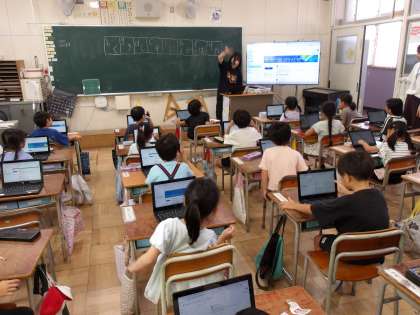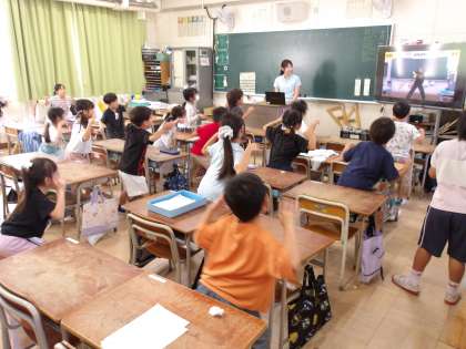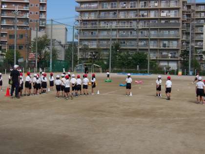 1年生の体育では運動場でコーンを使っていろいろな走り方をしました。教室では体育館の練習と学習者用端末の使い方を確認しています。