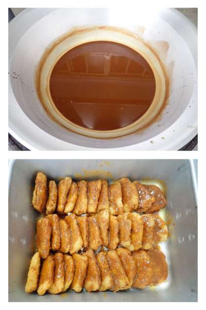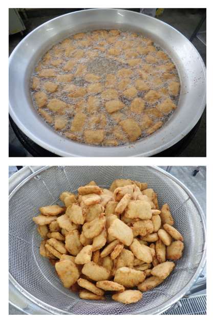今日の給食では、八丁みそ、赤みそ、砂糖、みりん、水を合わせたみそだれをかけています。