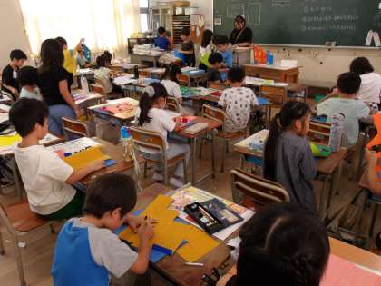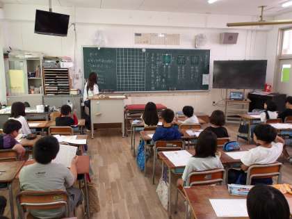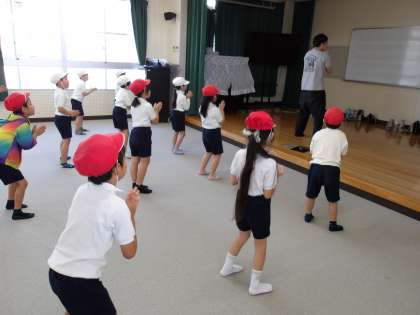 2年生の授業の様子です。体育は第2音楽室で運動会の練習です。図工は色画用紙の「まど」に絵の具などできれいな飾りつけをしています。国語は家族に対する感謝の気持ちを伝える作文を書きました。