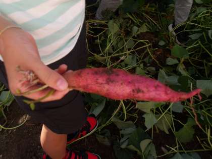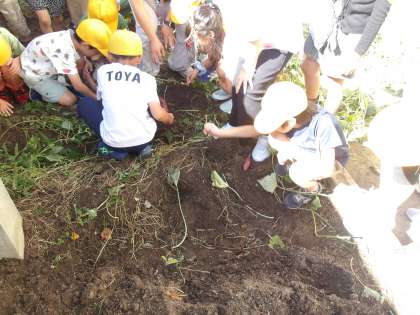 2年生の芋掘りの様子です。さつまいもがどんなふうにできるのか、つるはどう生えているのかなど観察をしながら収穫をしました。土の中から昆虫の幼虫がでてくるなど、いろいろな体験をすることができました。