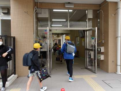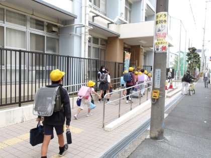 今日の登校の様子です。今週はあいさつ週間ですので、代表委員の児童が玄関であいさつをしています。また、元気にあいさつができたらシールをもらってみんなで台紙にシールをはっていきます。