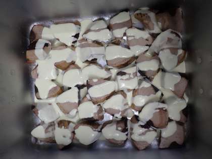 これまではマリネ液をつけてから焼き物機でかつおを焼いていましたが、今回は焼いたかつおににんにく、塩、こしょう、ノンエッグドレッシングを合わせて作ったソースをかけます。
