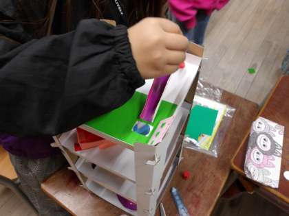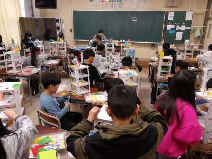 4年生の図工で、厚紙を使ったビー玉コースターを作成している様子です。ゲーム性を取り入れたり、飾りをつけたりと楽しく、工夫して作成しています。