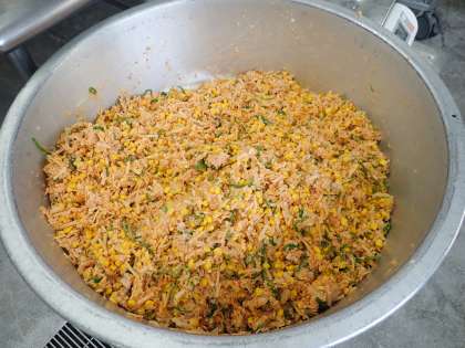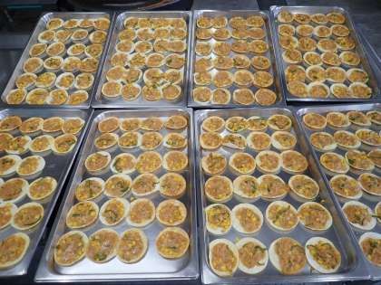 給食の変わりピザは、ぎょうざの皮にツナ、コーン、ピーマン、チーズ、ピザソースを混ぜ合わせた具をのせて、焼き物機で焼きます。