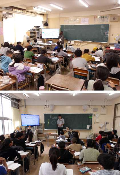 2年生の生活科では紙コップを使ったおもちゃ作りに取り組んでいます。4年生の数学では図形の学習をしています。写真は平行な線について考えているところ、四角形について考えているところです。6年生の国語は複合名詞の違いについて学習しました。