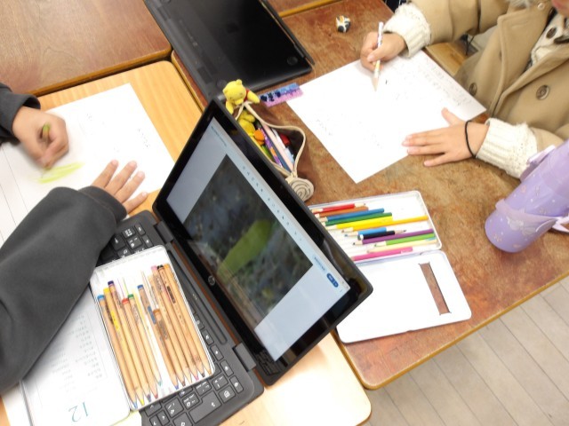 2年生の体育では体育館で反復横跳びを行いました。また、生活科では冬の校庭の様子を観察し、端末で撮った写真などをもとに、観察記録を作成しました。