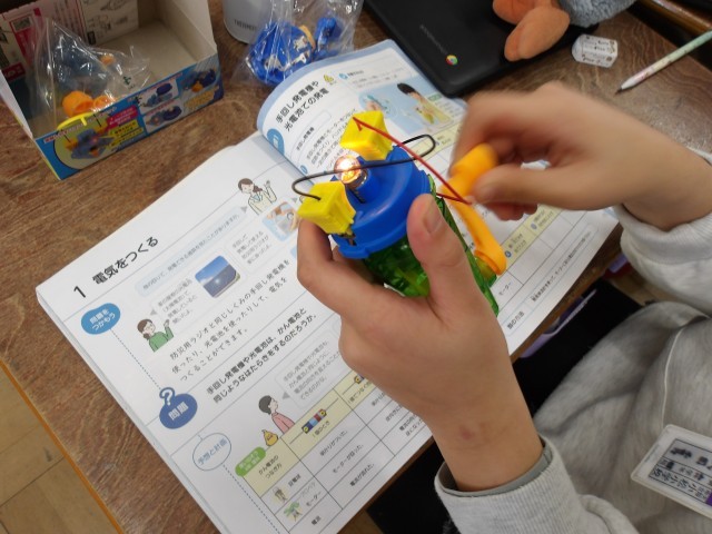 6年生の理科は電気について学習しています。手回し発電機を使って、電気をつくり、いろいろと条件を変えてその関係について考えました。