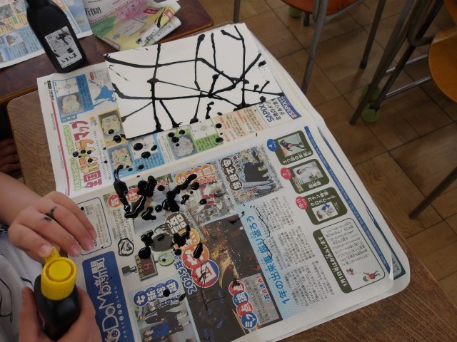6年生の図工では墨汁を使った作品に取り組んでいます。画用紙に墨汁をたらし作品を描いていきます。