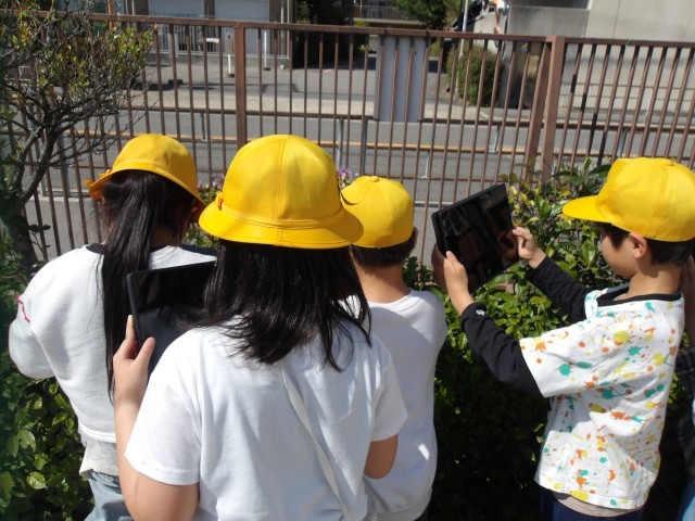 4年生の理科では校庭に出て春の生き物を探しました。見つけた生き物を観察した後、学習者用端末を使って記録しました。