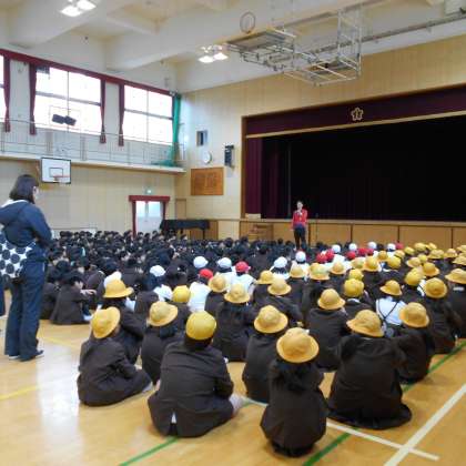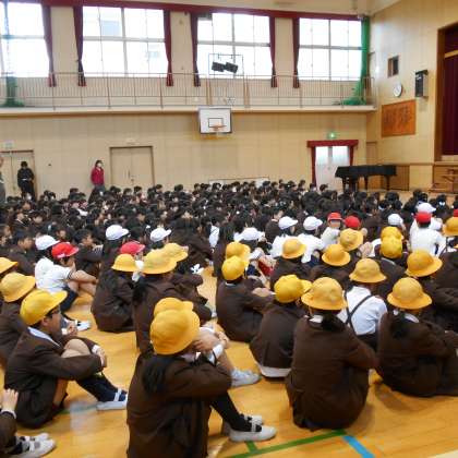 あいにくの雨天のために、避難場所を講堂としましたが、みんな素早く避難することができました。今回は、火災を想定しての避難訓練でしたが、地震や台風等いろいろな場合が想定できます。安全に避難ができるように、普段から話をよく聞いて、気をつけておくことが大切です。