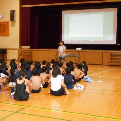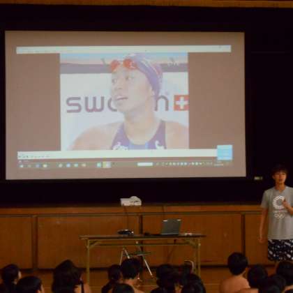 オリンピックや世界大会で活躍したトップアスリートに学校を訪問していただき、講演や実技指導をしていただきました。今回は、シドニー・アテネ・北京と3大会連続出場された水泳の「中西悠子」さんをお迎えしての講演と実技の指導をしていただきました。