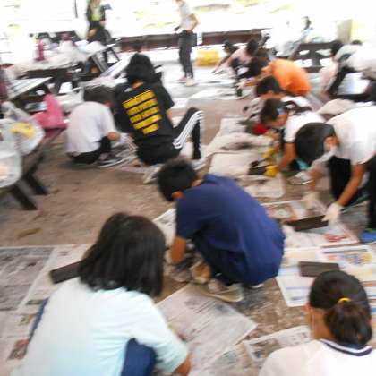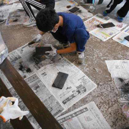 雨が降ったり、やんだりなので、天候の様子を見ながら、登山に出発します。それまで、焼き板に磨きをかけます。きれいな木目が見えるようにしっかりと磨こう。