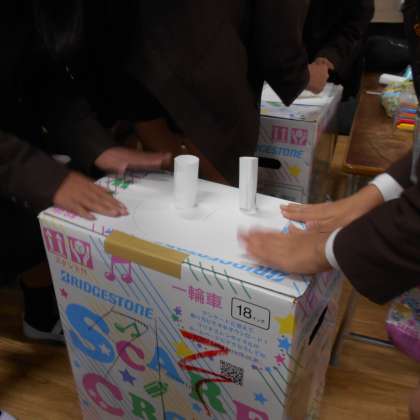 「たてわり班のみんなで協力して、おもちゃを作って楽しく遊ぼう」をめあてにおもちゃ作りを計画し、遊び方やルールを決め、低学年から高学年まで力を合わせて取組みました。「トントン紙ずもう」「わなげ」「フーフー競馬レース」などいろいろと工夫した遊びができました。